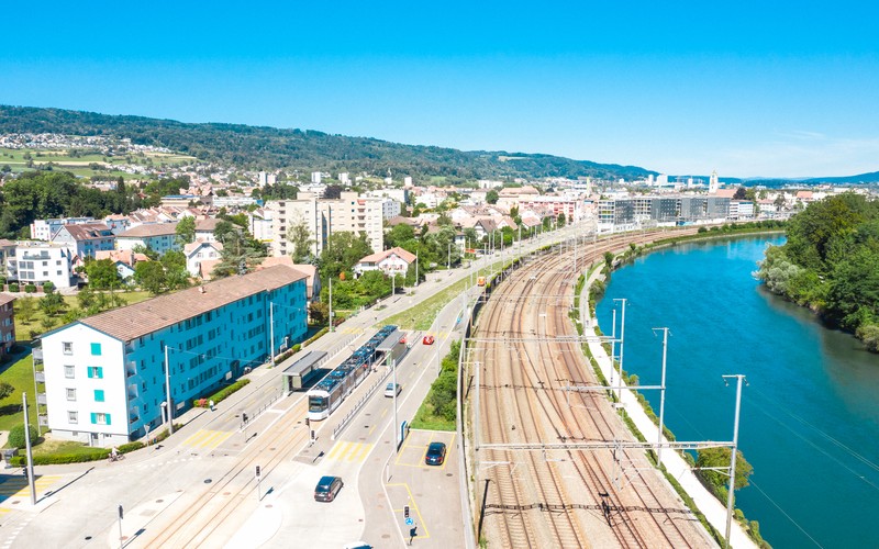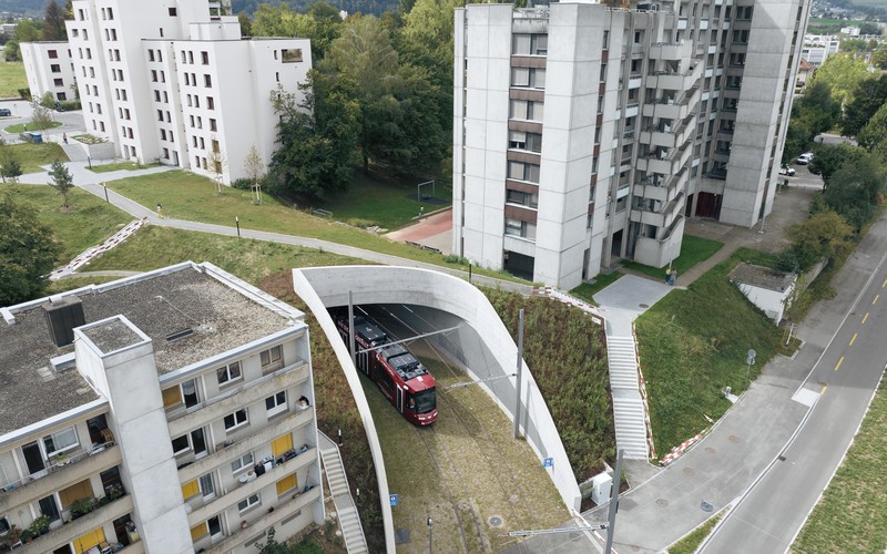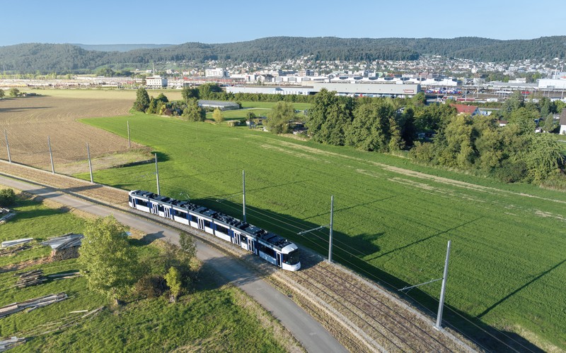Die Limmattalbahn fährt deshalb wo immer möglich auf Grüntrassee, sprich auf begrünten Schienenbeeten. Das führt zu weniger versiegelten Flächen und hat einen kühlenden Effekt, da Wasser verdunsten kann. Ausserdem wurden entlang der gesamten Strecke schattenspendende Bäume gepflanzt. Bis die Alleen und Schienenbeete voll entwickelt sind, wird es naturbedingt noch einige Jahre dauern – um dann hoffentlich weiteren Hitzerekorden vorzubeugen.