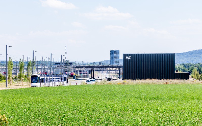 Es ist nicht zu übersehen: das neue Depot Müsli der Limmattalbahn. Eingebettet zwischen Rangierbahnhof und grüner Wiese breitet sich die 150 Meter lange, schwarze Wellenfassade aus. Das Zuhause der Limmattalbahn steht auf dem Grenzgebiet zwischen Dietikon und Spreitenbach und zwischen den Haltestellen Kreuzäcker und Niderfeld. Hier beginnt und endet für die Trams jeder Arbeitstag. Sie werden in der langen Waschstrasse geduscht und vom Podest oder der Arbeitsgrube aus gewartet. Den Kontrast zum dunklen Äusseren bilden die Innenräume, die komplett in einem hellen Grau gehalten sind und durch vier Hauben mit viel Tageslicht versorgt werden. Denn im Depot befinden sich auch Büros, Werkstätten und Lagerflächen. Jürg Senn ist Mitbegründer von 10:8 Architekten und hat die Limmattalbahn-Haltestellen und das Depot gestaltet. Laut ihm wurde die Verlängerung beim Bau schon mit berücksichtigt. Das Depot ist für eine mögliche Vergrösserung ausgelegt.