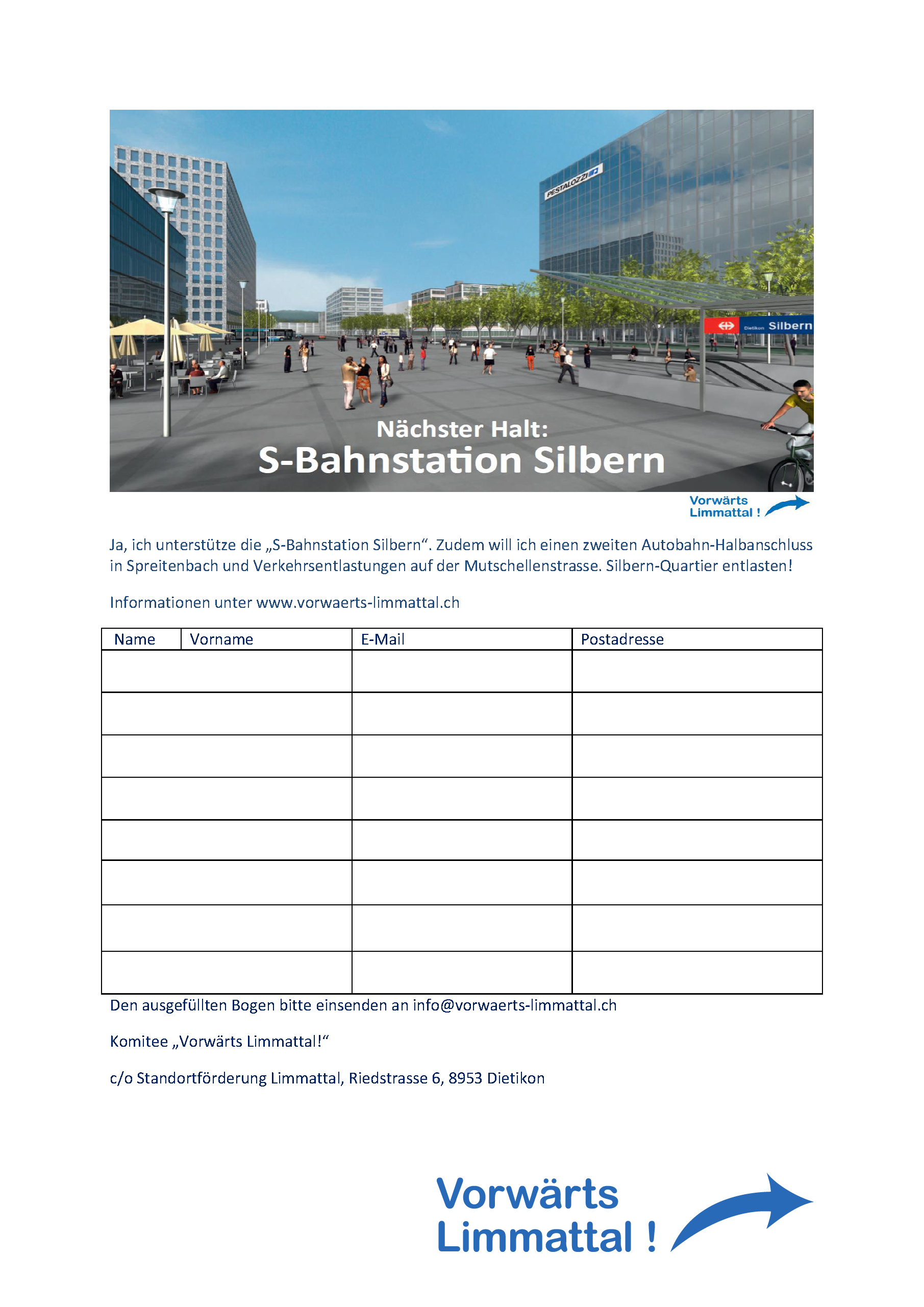 Silbern ist das grösste zusammenhängende Arbeitsplatzgebiet, Lebens- und Freizeitraum, im Kanton Zürich. Seit Jahren leidet es unter dem Verkehr. „Vorwärts Limmattal!“, das Komitee für Verkehrslösungen in der Region, fordert ein dringliches Massnahmenpaket zur Lösung der Verkehrsprobleme. Davon profitiert nicht nur das Gebiet, sondern die ganze Region!