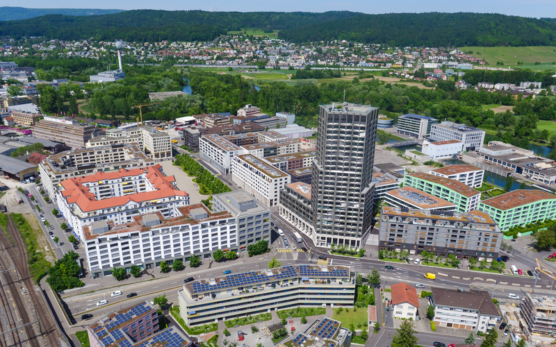 Foto: Raumgleiter AG, Das heutige Stadtquartier Limmatfeld mit dem prägenden Limmattower, der 80 Meter in die Höhe ragt.